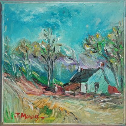 Pictura impresionistă „Căsuța de lângă livadă” în vopsele de ulei pe pânză fixată pe cadru de lemn, este realizată prin pictare manuală de către artistul plastic Monea Teofil în anul 2023.