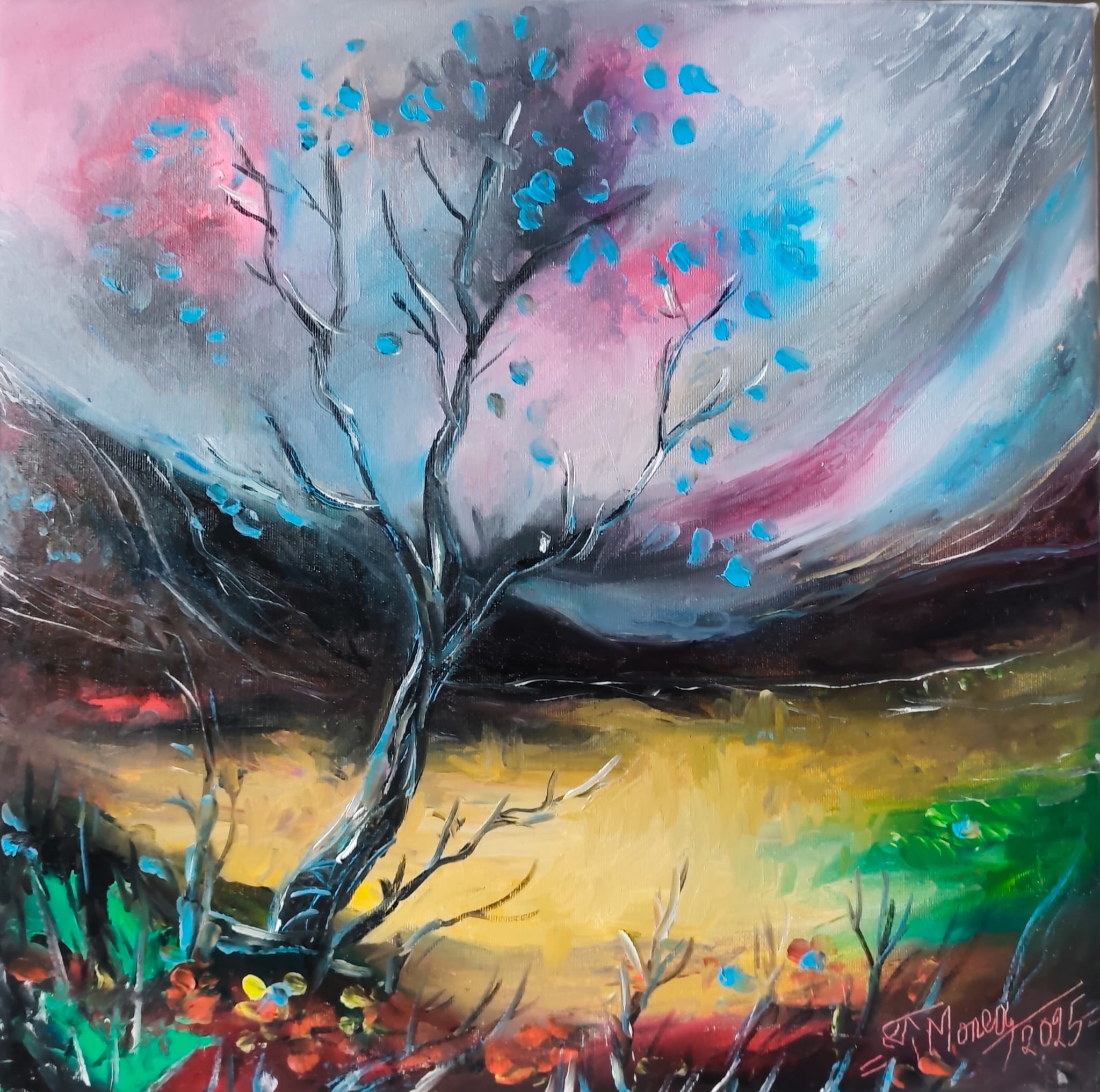 Pictura „Copacul cu frunze albastre” în vopsele de ulei pe pânză fixată pe cadru de lemn, este realizată prin pictare manuală de către artistul plastic Monea Teofil în anul 2025.