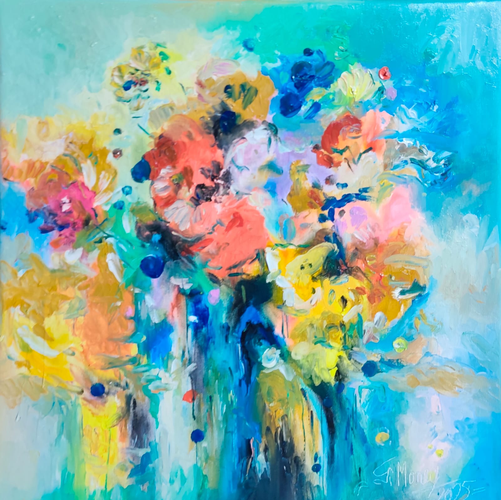 Lucrarea prezintă un buchet abstract, plin de culoare și mișcare, construit din pete de roz, corai, galben, albastru și turcoaz. Florile nu sunt redate realist, ci apar ca forme fluide, strat peste strat, într-un ritm vizual intens. Textura groasă a pensulei creează relief și dinamism, iar fundalul deschis, în nuanțe de verde pal și bleu, lasă senzația unei lumini puternice care vine din toate direcțiile. Picăturile de albastru închis punctează compoziția și adaugă contrast, ca niște accente care fixează privirea. Atmosfera tabloului este vibrantă, optimistă, cu o energie explozivă care sugerează o explozie de flori surprinsă în plină expansiune. Este un tablou care nu stă locului: simți efectiv că se mișcă.