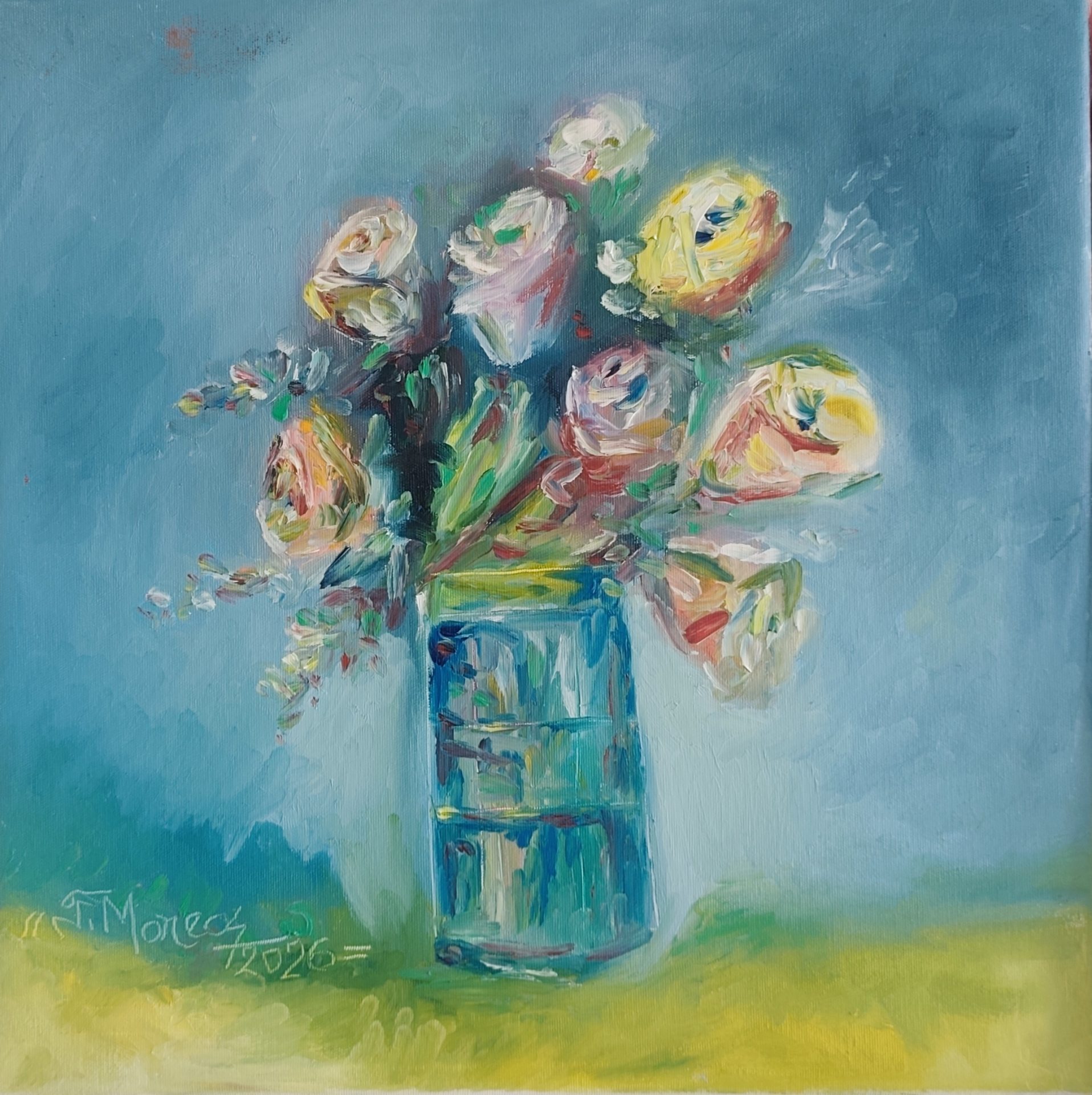 Pictura „Flori 2” în vopsele de ulei pe pânză fixată pe cadru de lemn, este realizată prin pictare manuală de către artistul plastic Monea Teofil în anul 2025.