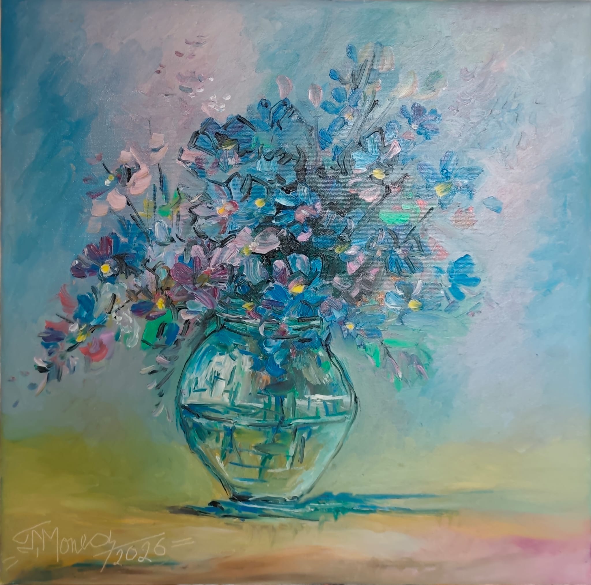 Flori cu puncte de soare este o natură statică construită din transparență, culoare și mici accente luminoase care atrag privirea. În centru, o vază rotundă de sticlă, redată prin tușe scurte și reflexe turcoaz, susține un buchet bogat de flori în nuanțe de albastru, violet și roz pal. Compoziția nu e rigidă, ci aerisită, cu flori care ies în lateral și cu petale sugerate prin gesturi rapide de pensulă, ca și cum buchetul ar avea o mișcare ușoară.