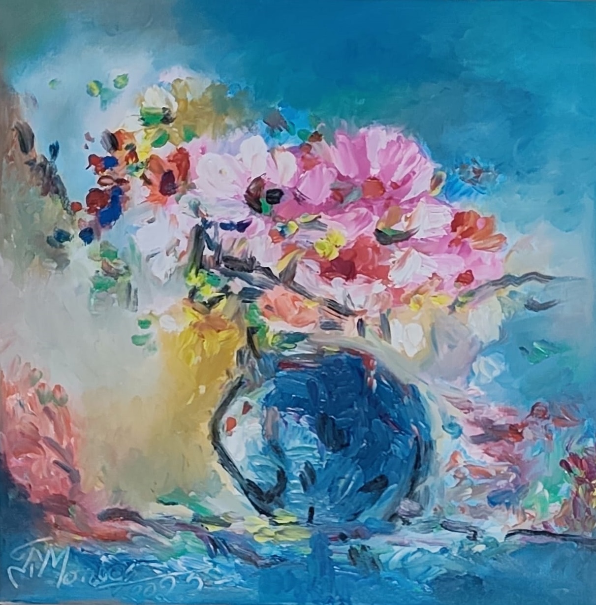 Nuanțele de roz, galben, roșu și verde plutesc în aer ca petale aduse de vânt, topindu-se treptat în albastrul dominant. Totul pulsează într-un echilibru între transparență și intensitate. Privind tabloul, ai impresia că florile s-au născut chiar din lumină, că razele cerului s-au adunat pentru o clipă și au prins formă într-un buchet imaginar.