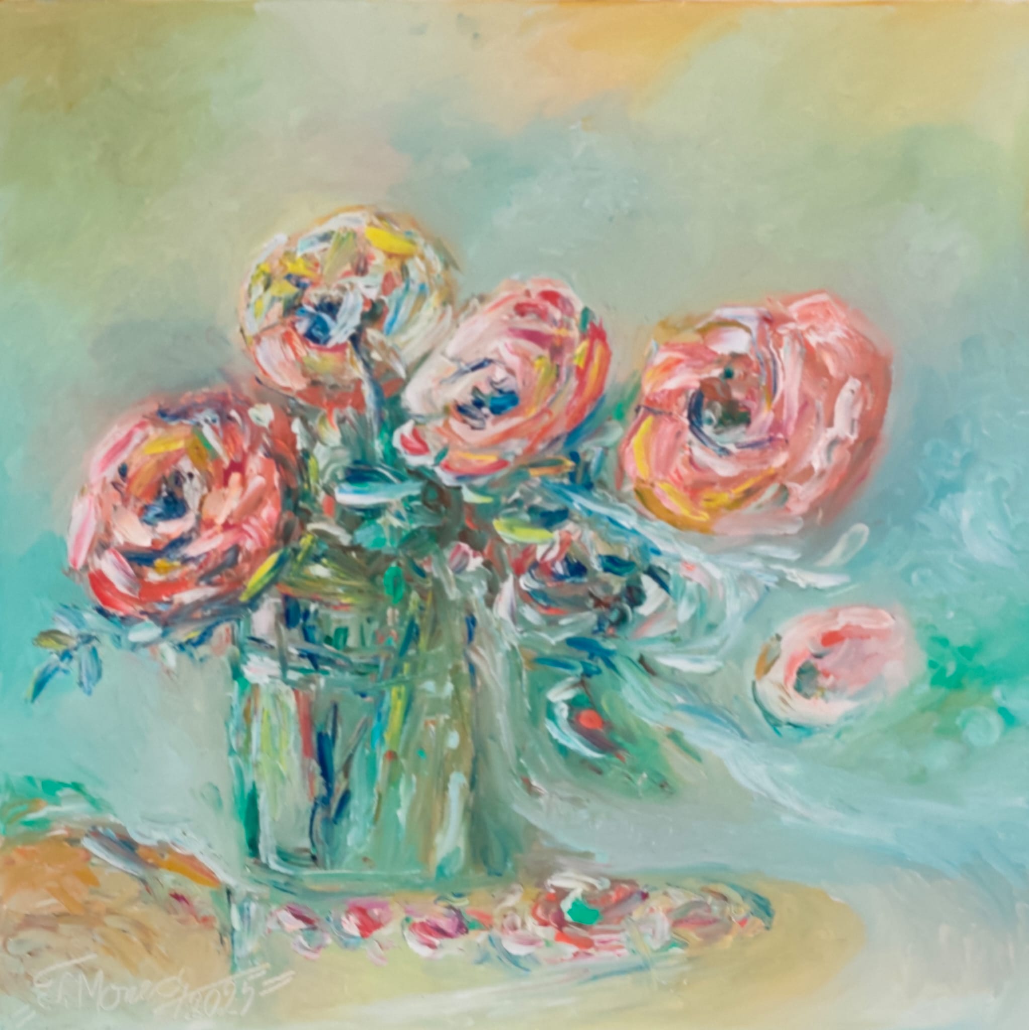 Fundalul este dominat de tonuri pastelate de turcoaz și verde deschis, amestecate cu bejuri calde, ca o lumină blândă de dimineață. Această paletă deschisă dă senzația de spațiu și de respirație, iar buchetul pare să plutească ușor în atmosferă, nu să stea rigid într-o compoziție fixă. În partea dreaptă, o floare desprinsă, redată ca o pată rotundă de roz, întărește ideea de naturalețe și de moment surprins din viața de zi cu zi.