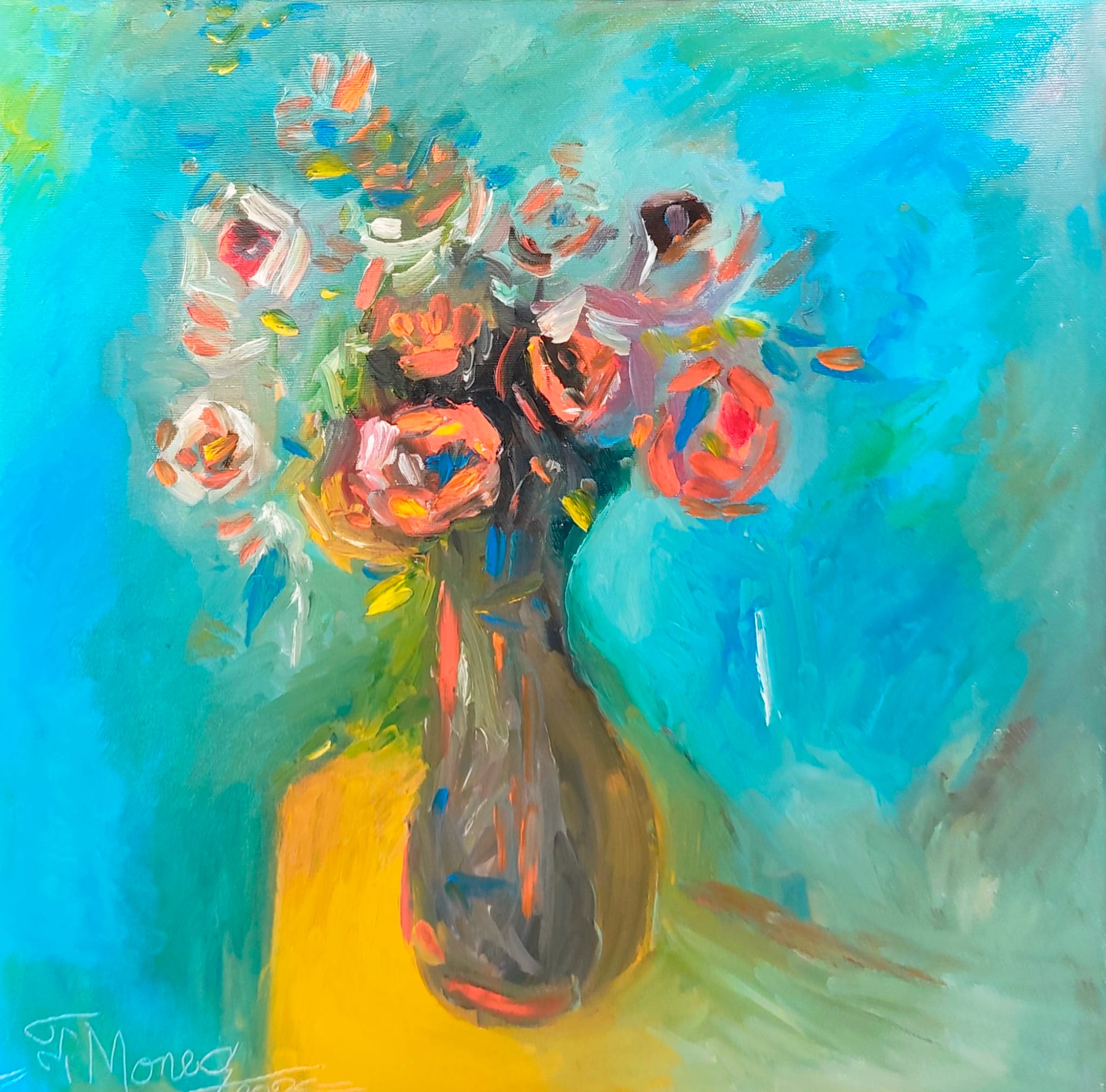 Lucrarea funcționează ca un studiu de culoare și echilibru: un buchet expresiv, prins între un spațiu albastru care respiră și o bază galbenă care încălzește scena.