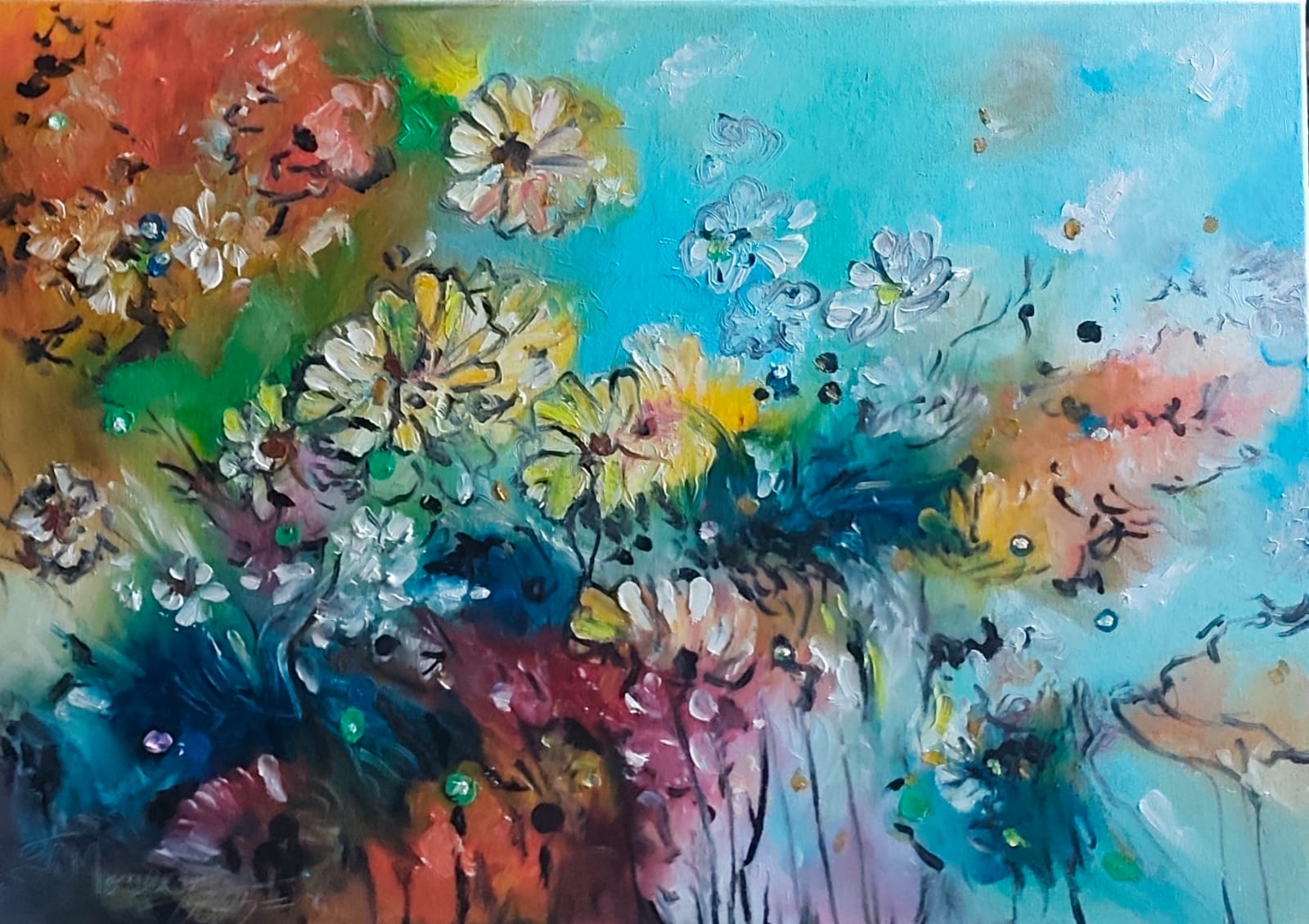 Tabloul redă un buchet de flori stilizate, dispersate într-o mișcare liberă, ca și cum ar fi desprinse de o adiere ușoară. Fundalul este construit pe o trecere fluidă între albastru deschis și nuanțe calde de portocaliu, roz și auriu, iar florile apar strat peste strat, cu tușe groase, vibrante. Accentele de verde și turcoaz adaugă prospețime, iar petele întunecate punctează compoziția și îi dau ritm. Florile nu sunt redate realist, ci doar sugerate, ceea ce creează senzația unei grădini în mișcare, surprinsă în lumina unei dimineți care schimbă culorile de la o clipă la alta. Lucrarea transmite vitalitate, creștere și un sentiment de ușurință, ca un moment prins între calm și energie.