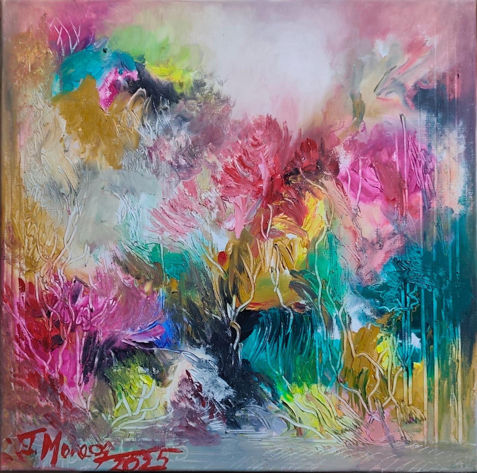 Pictura evocă ideea unei grădini interioare, un spațiu imaginar unde emoțiile și gândurile se manifestă sub forma culorilor. Texturile bogate și gesturile ample ale pensulei creează profunzime și mișcare, dând senzația că privitorul pășește într-o lume vie, aflată între lumină și umbră, între haos și armonie.