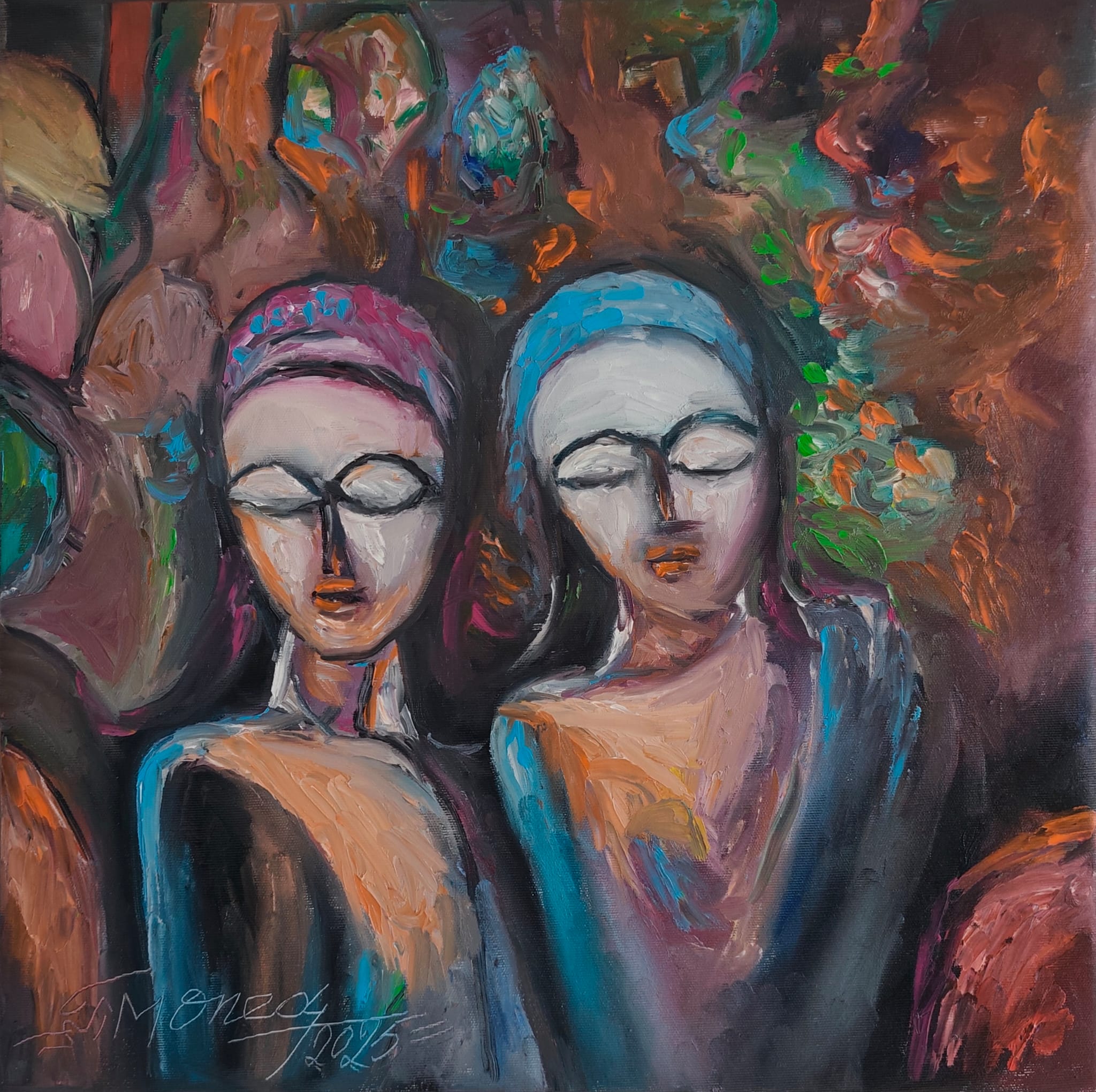 Două siluete se desprind din agitația unui fundal viu, ca și cum lumea din jur ar pulsa într-un ritm propriu, greu de deslușit. Ochii lor sunt închiși, dar prezența lor este intensă, conectată printr-o liniște comună. Trec dincolo de real, acolo unde culorile devin emoții și lumina poartă gânduri nerostite.