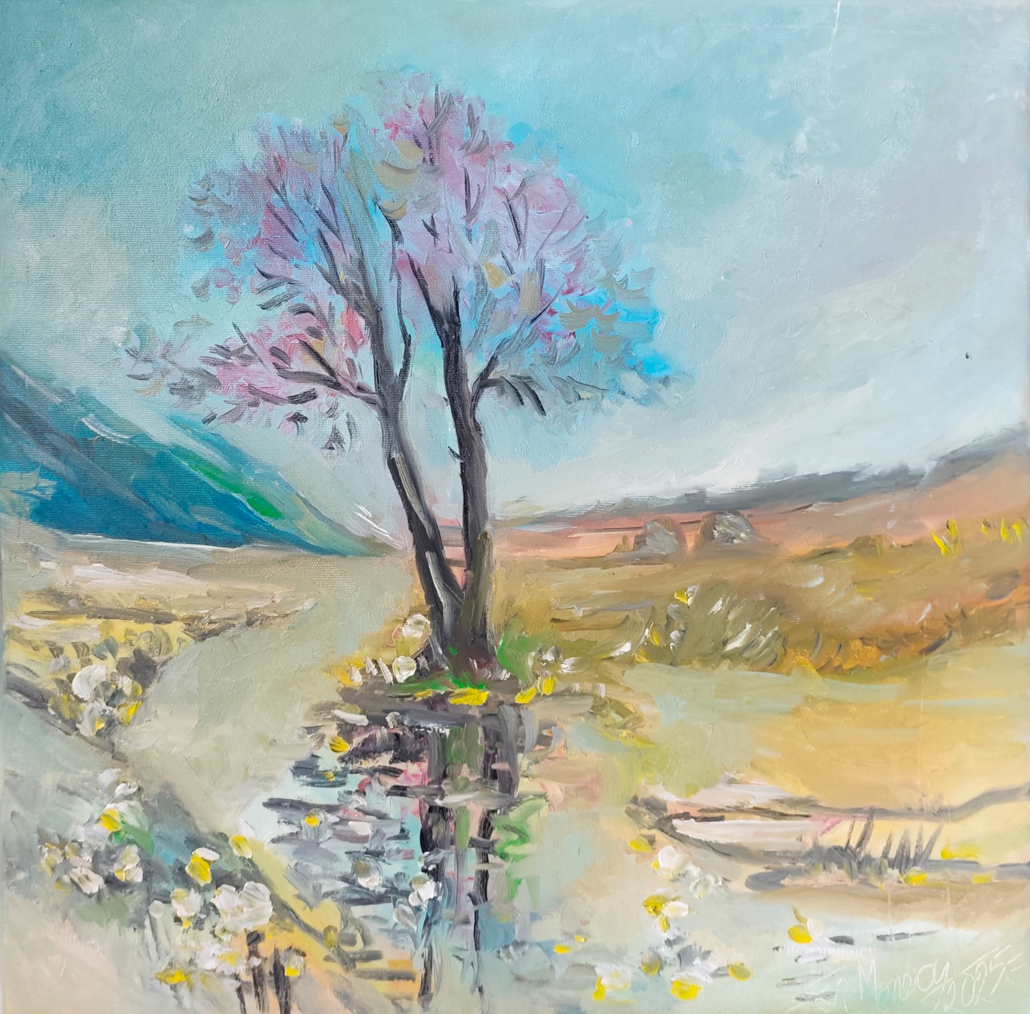 Cromatica se joacă între rece și cald. Cerul este dominat de nuanțe de albastru pal și turcoaz, în timp ce terenul trece prin ocru, bej și tonuri aurii, ca un început de sezon când iarba nu e încă intens verde, dar pe margini apar deja pete de culoare. În zona copacilor, frunzișul are accente roz-liliachii, care sugerează înflorire sau o lumină specială prinsă în ramuri, fără să transforme scena într-un peisaj strict realist. În prim-plan, florile mici, deschise la culoare, marchează marginea apei și dau senzația de detaliu apropiat, ca și cum ai sta chiar lângă mal.
