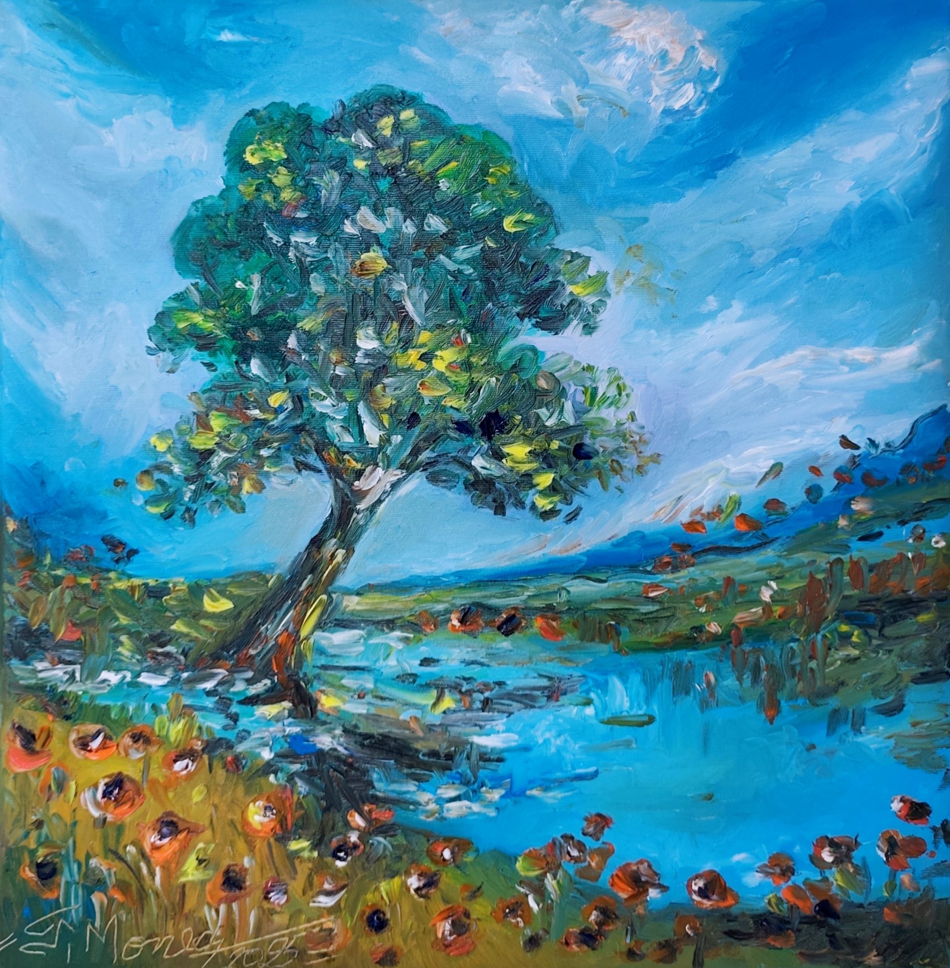 Malul este presărat cu flori simple, pictate liber, care aduc viață peisajului fără să-i tulbure liniștea. Apa adună nuanțele din jur și le păstrează într-o tăcere blândă, ca o amintire care nu se grăbește să plece. Totul pare stabil, așezat, ca un loc cunoscut în care revii fără să cauți nimic anume.