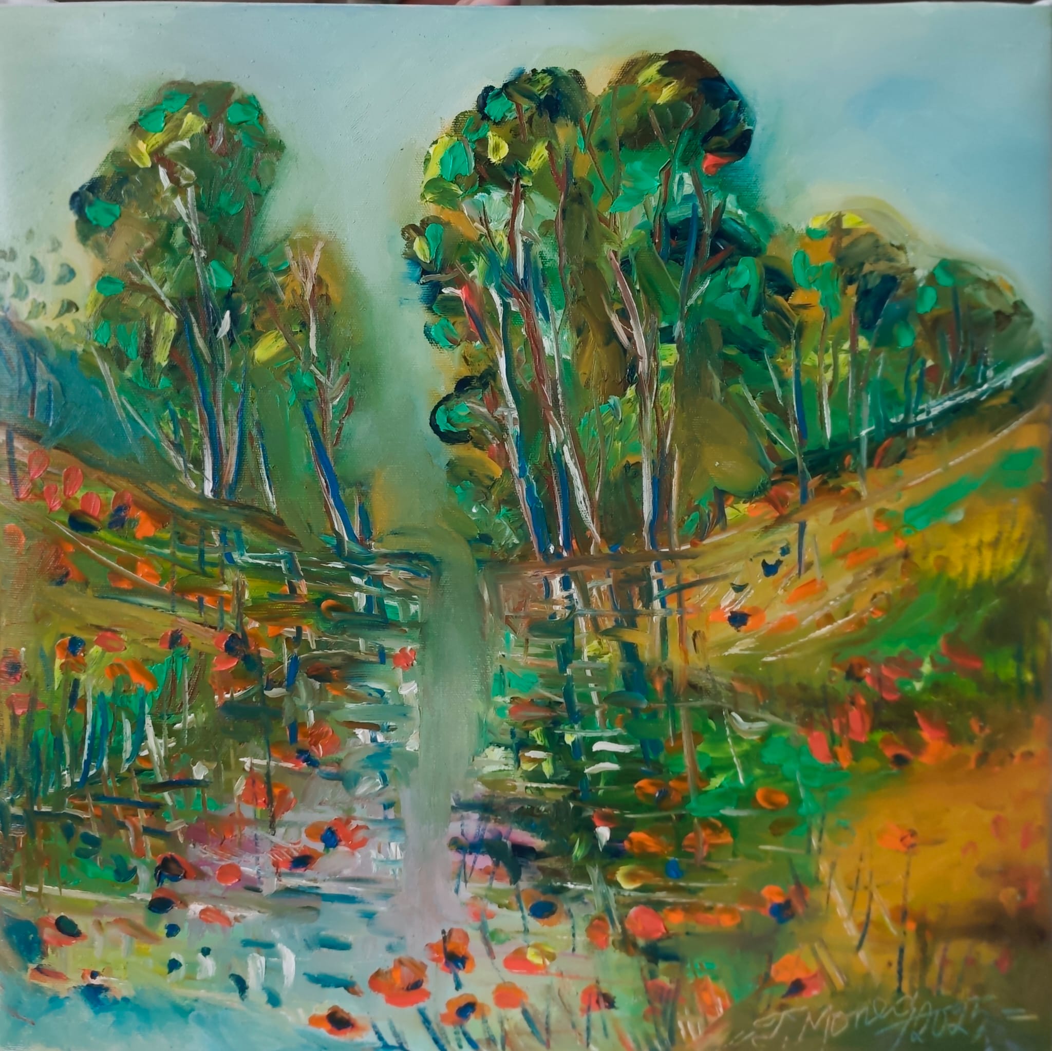 Maluri colorate cu maci surprinde un peisaj construit din reflexie și din ritmul culorilor. În centru, luciul de apă funcționează ca o axă care împarte scena și o leagă în același timp: ce este pe mal se continuă în apă, prin forme și nuanțe, ca într-o oglindă ușor mișcată. De o parte și de alta, copacii apar în grupuri, cu trunchiuri subțiri și coroane dense, pictate în verdeuri diferite, cu accente de galben și turcoaz, ca o lumină filtrată prin frunziș.