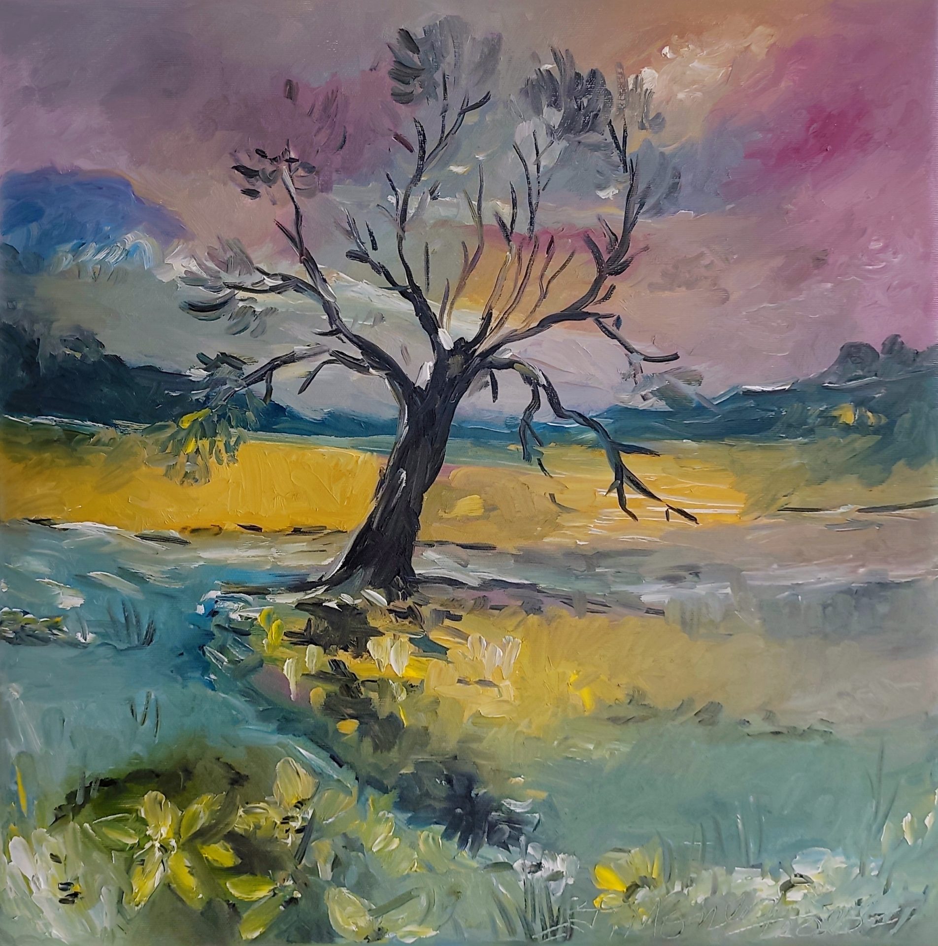 Tabloul surprinde un peisaj deschis, în care pământul și cerul se întâlnesc fără granițe clare, unite de prezența unui copac singuratic. Trunchiul închis la culoare se ridică din câmpul luminos, ca și cum ar fi modelat de vânt și de trecerea anilor. Ramurile sale, rare și neregulate, se întind spre cer fără grabă, lăsând impresia unei creșteri oprite, dar nu abandonate.