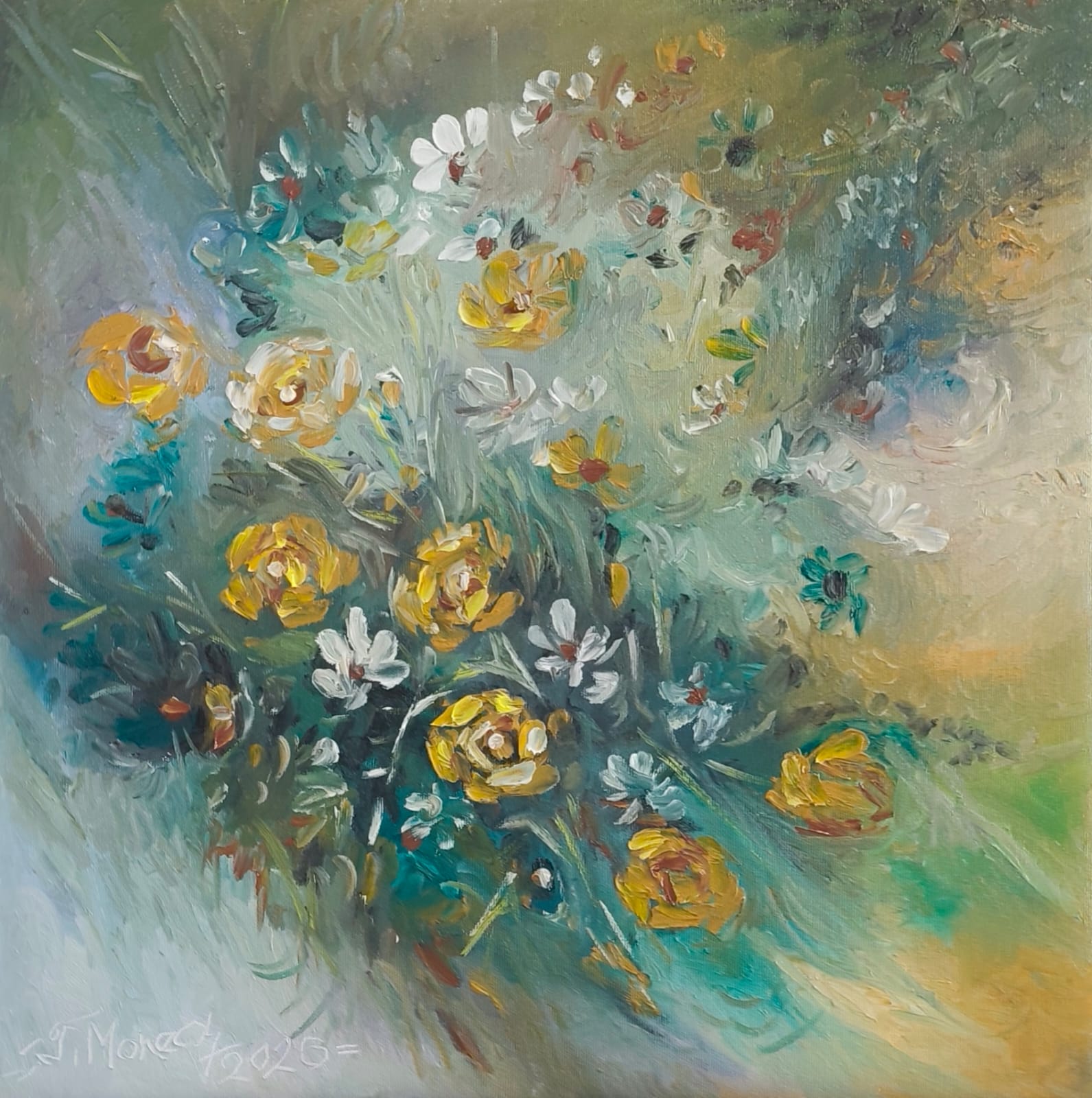 Petale de aramă sugerează un buchet surprins într-un moment de mișcare, ca și cum florile ar fi fost așezate în grabă, iar lumina ar fi rămas prinsă între frunze și petale. În centrul compoziției apar accente calde, galben-ocru, care trimit spre nuanța metalică a aramei, în contrast cu tonurile reci de turcoaz, verde stins și gri-albăstrui din fundal. Tușele sunt scurte și hotărâte, cu pastă vizibilă, iar forma florilor se construiește din suprapuneri, nu din contururi ferme, ceea ce face ca buchetul să pară viu și instabil, ca într-o briză.